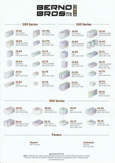 Berno Bros products also include a large range of concrete block series which are manufactured at Berno’s depot using our own resource materials, assuring the best quality products at very competitive prices!